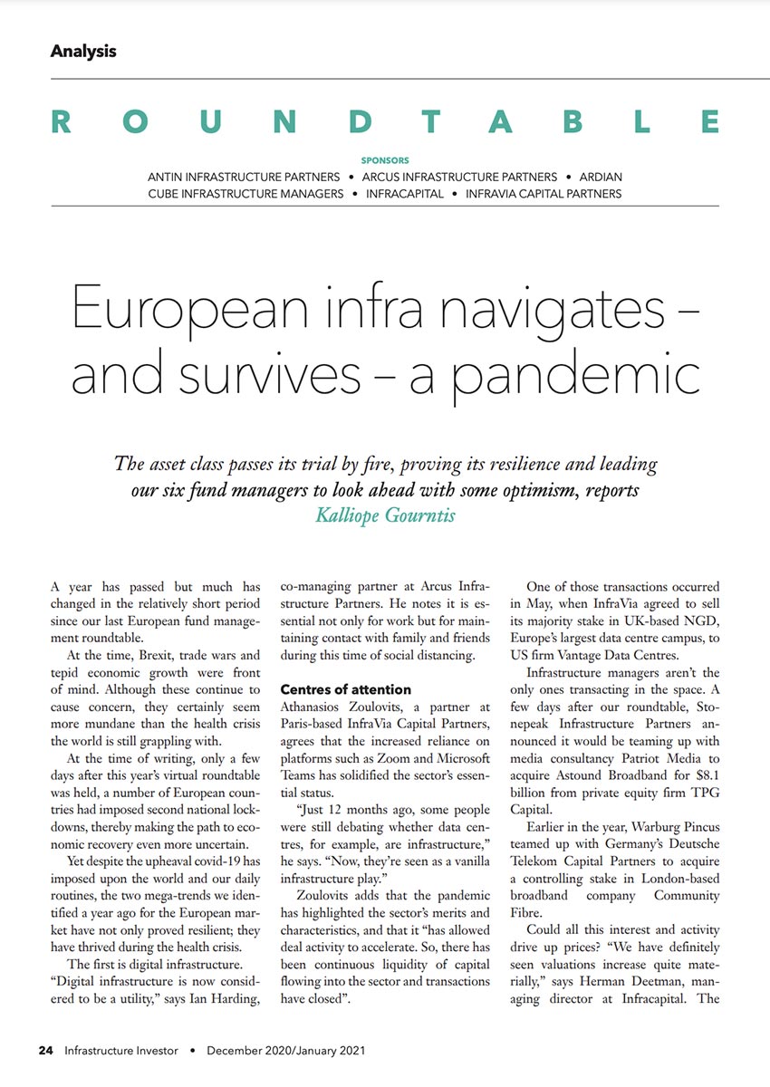 The first is digital infrastructure. “Digital infrastructure is now considered to be a utility,” says Ian Harding, co-managing partner at Arcus Infrastructure Partners. He notes it is essential not only for work but for maintaining contact with family and friends during this time of social distancing.